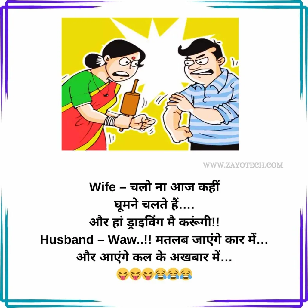 इन जोक्स पढ़ने के बाद आप जानेंगे कि शादीशुदा जीवन उतनी ही खतरनाक होता है।👉दोस्तों, आप जानते हैं कि पति-पत्नी का रिश्ता बहुत अलग होता है। कभी बहुत प्यार होता है, तो कभी छोटी-छोटी बातों पर विवाद होता है। पति महाशय कभी नाराज हो जाते हैं जब पत्नी मुँह फुला लेती हैं, लेकिन उनका प्यार कभी नहीं मरता।